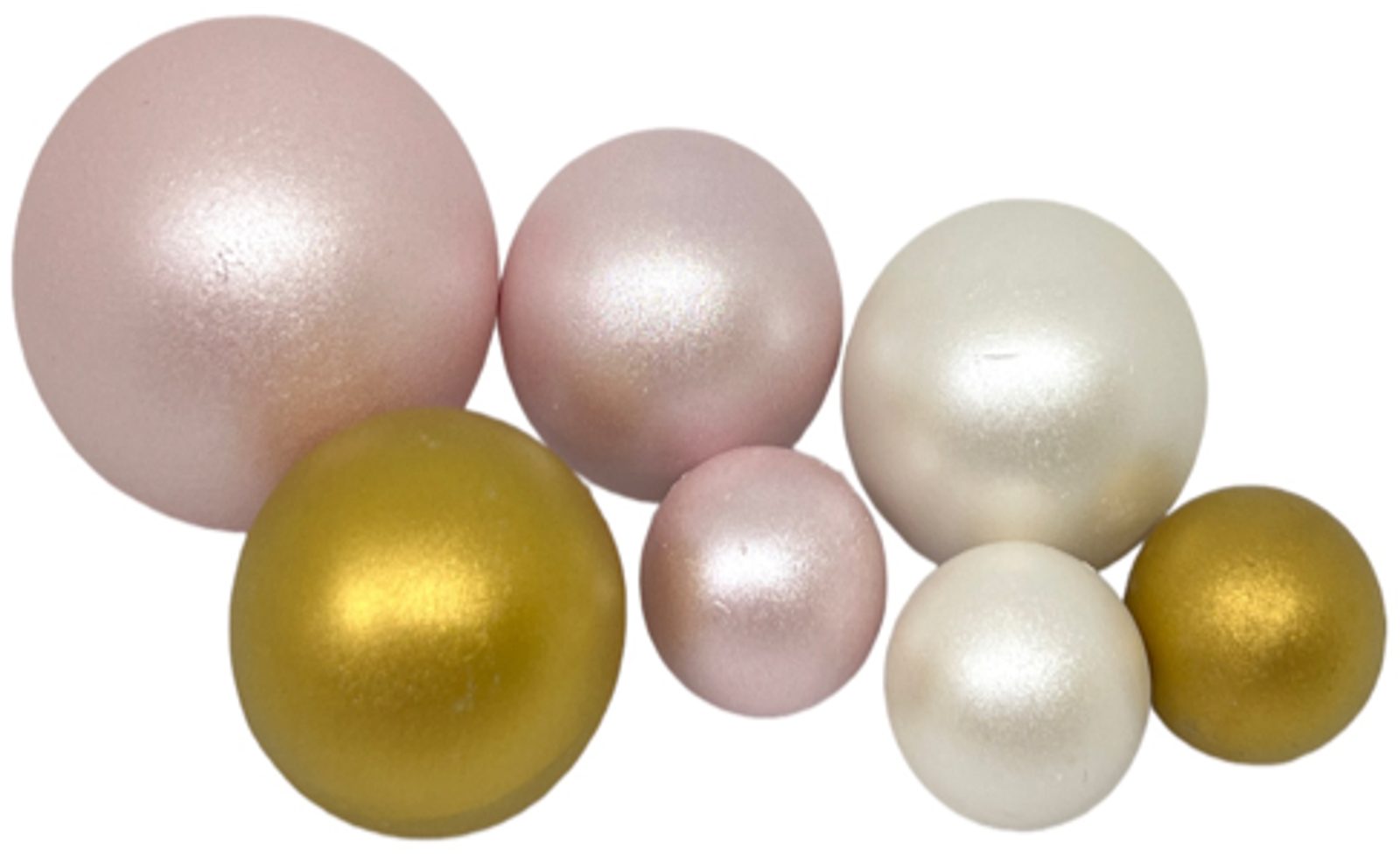 Perleťové čokoládové gule v ružovo-bielo-zlatých odtieňoch dodajú tortám a dezertom okamžitý „wow“ efekt. Elegantná dekorácia v troch veľkostiach pre slávnostný, profesionálny vzhľad.