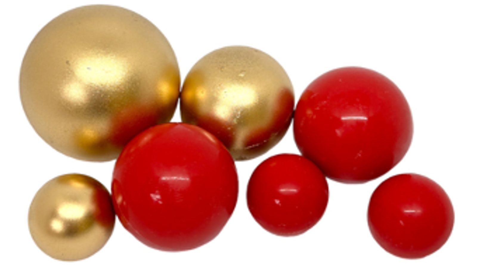 Čokoládové gule zlaté a červené sú výnimočná sada, ktorá poteší nielen chuťou, ale aj elegantným vzhľadom. Každá zo siedmich gulí je starostlivo vyrobená z kvalitnej čokolády, aby ponúkla dokonalé spojenie jedlej dekorácie a lahodného maškrtenia.