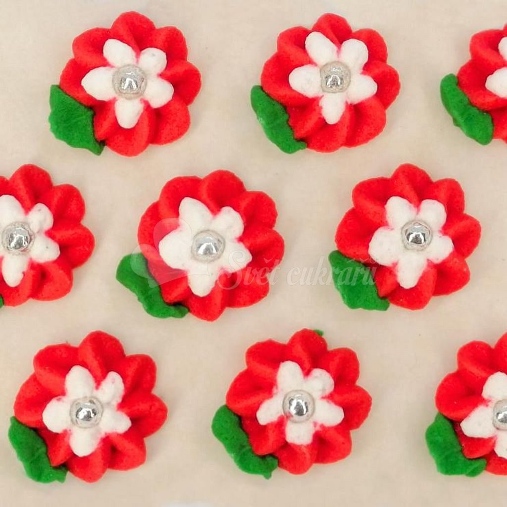 V balení nájdete 9 kvetov. Veľkosť jedného kvetu aj s lístkom je približne 2,5 cm, takže sa hodí na drobné dezerty aj ako doplnok väčších tort. Keďže ide o RUČNÚ VÝROBU, jednotlivé kusy sa môžu mierne líšiť – práve to im dodáva prirodzený, remeselný charakter. Foto je iba ilustračné.