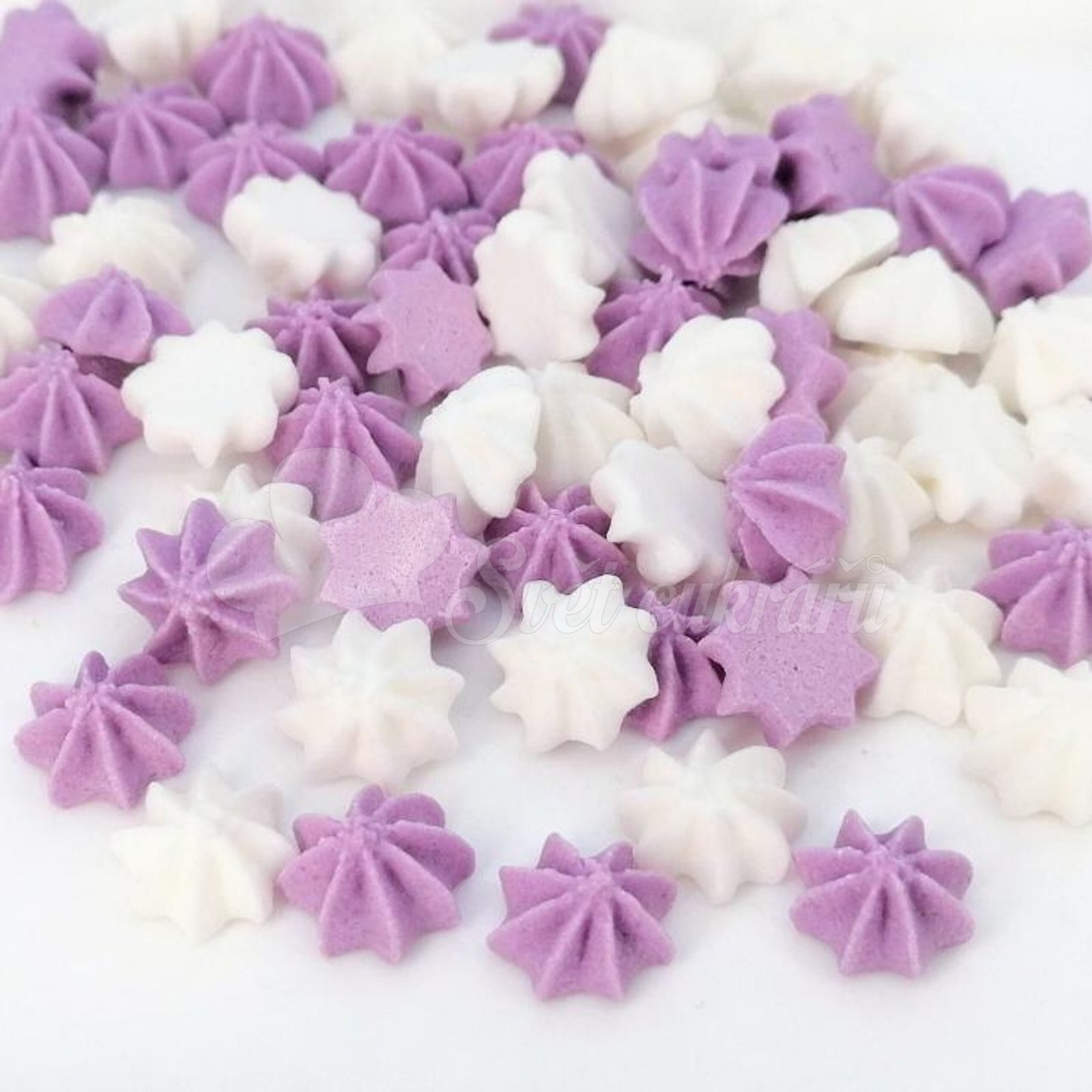 Pusinky pucky bielo-fialové dodajú tortám, cupcakes aj zmrzline jemný romantický akcent. Ručne vyrábané mini pusinky (cca 1 cm) pre rýchle a efektné zdobenie.