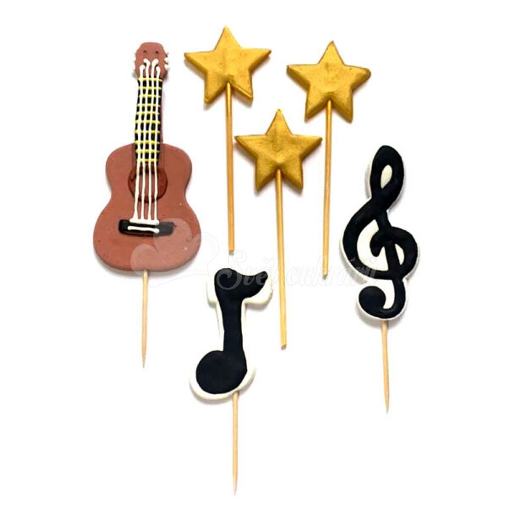 Cukrová dekorácia na tortu s motívom hudobných nástrojov, ideálna na oslavy a tematické príležitosti.