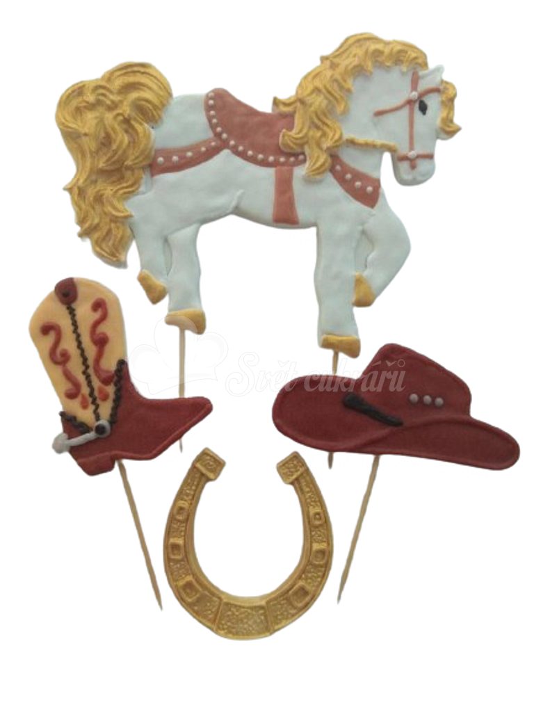 Cukrová dekorácia v tvare koníka so zápichom. Ideálna na výzdobu narodeninových a tematických tort. Balenie obsahuje všetko, čo vidíte na obrázku.