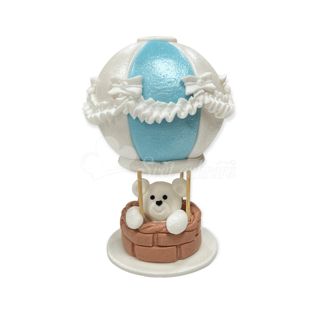 Cukrová dekorácia na tortu v tvare medvedíka s balónikom, modrá verzia. Dostupná aj v ružovej farbe.
