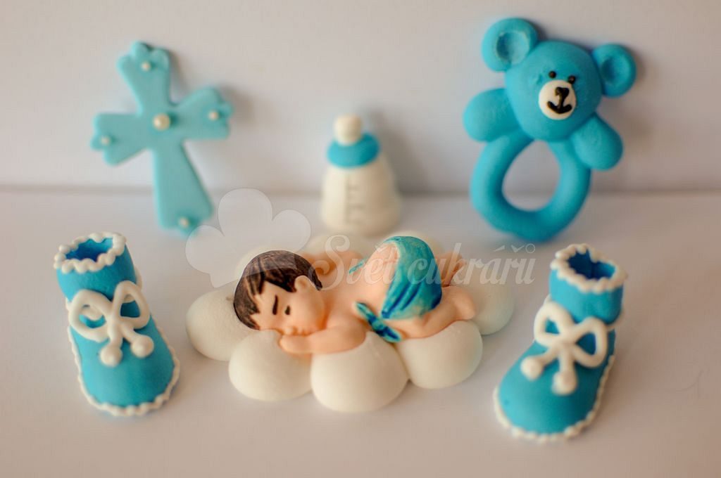 Cukrové dekorácie na tortu, ideálne na krstiny v modrej alebo ružovej farbe.