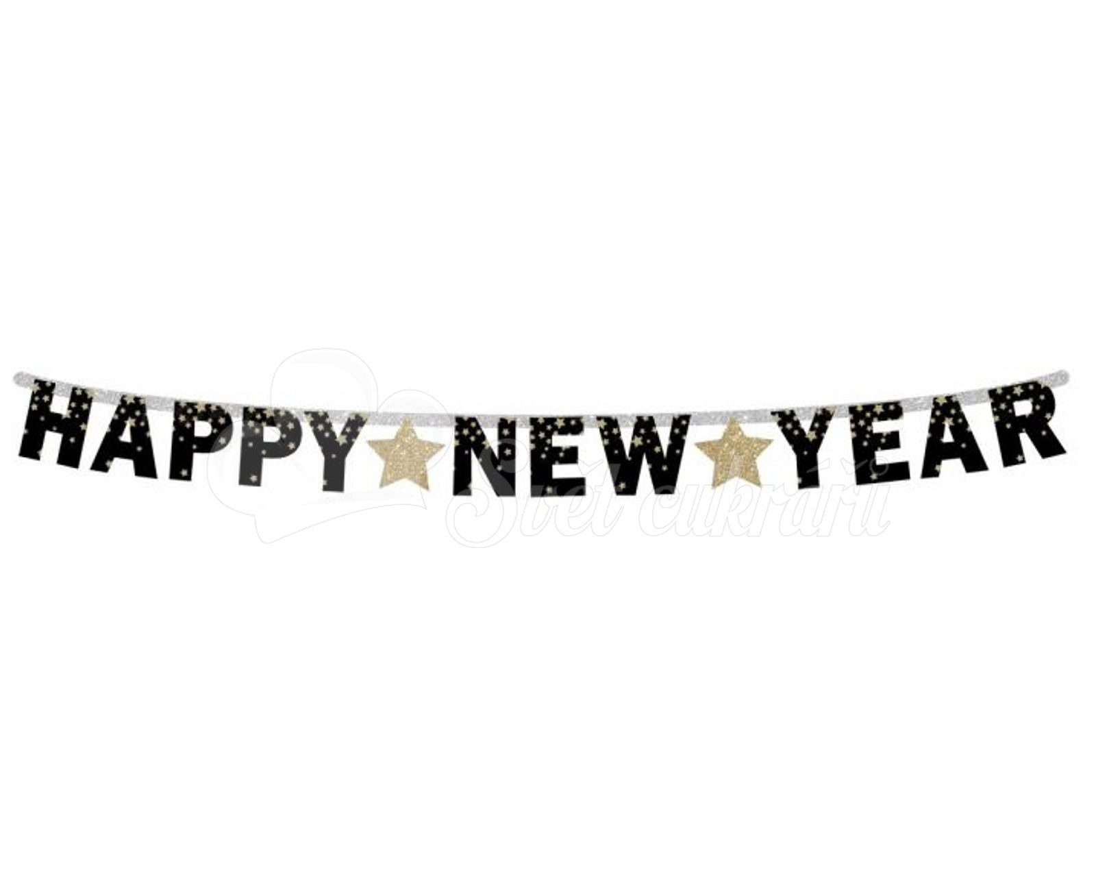 Silvestrovská girlanda ŠŤASTNÝ NOVÝ ROK so zlatými hviezdami je ideálna na štýlové oslavy konca roka.