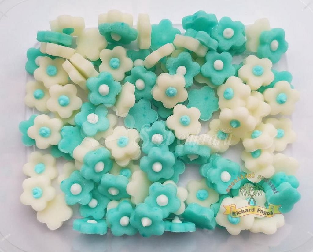 Drobné modré kytičky z kokosovej modelovacej hmoty s mandľovou arómou dodajú tortám a dezertom jemný, romantický detail. V balení je približne 120 ručne vyrábaných kúskov (cca 1,5 cm).