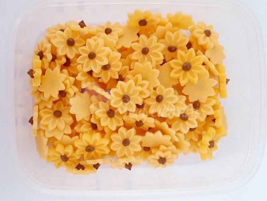 Drobné slnečnicové kytičky 20 g sú ručne vyrábané jedlé dekorácie z kokosovej modelovacej hmoty s vôňou sladkých mandlí. Dodajú tortám a zákuskom jemný, profesionálny detail bez námahy.