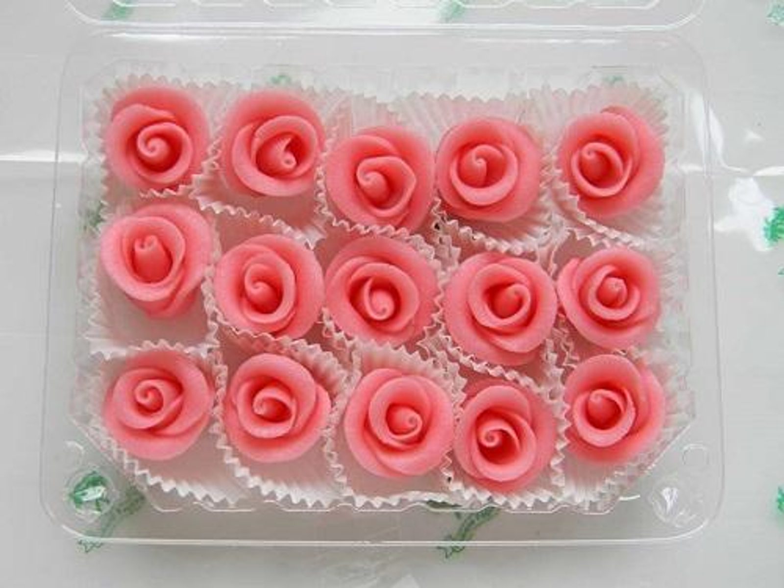 Každá ružička má cca šírku 2,3 cm a výšku 2 cm, kvet je zložený zo štyroch okvetných lístkov. Hmotnosť: cca 6 g. Využitie: zdobenie tort, zákuskov, svadobných tort, cupcakes a ďalších sladkých kreácií. Cena je uvedená za krabičku (15 ks).