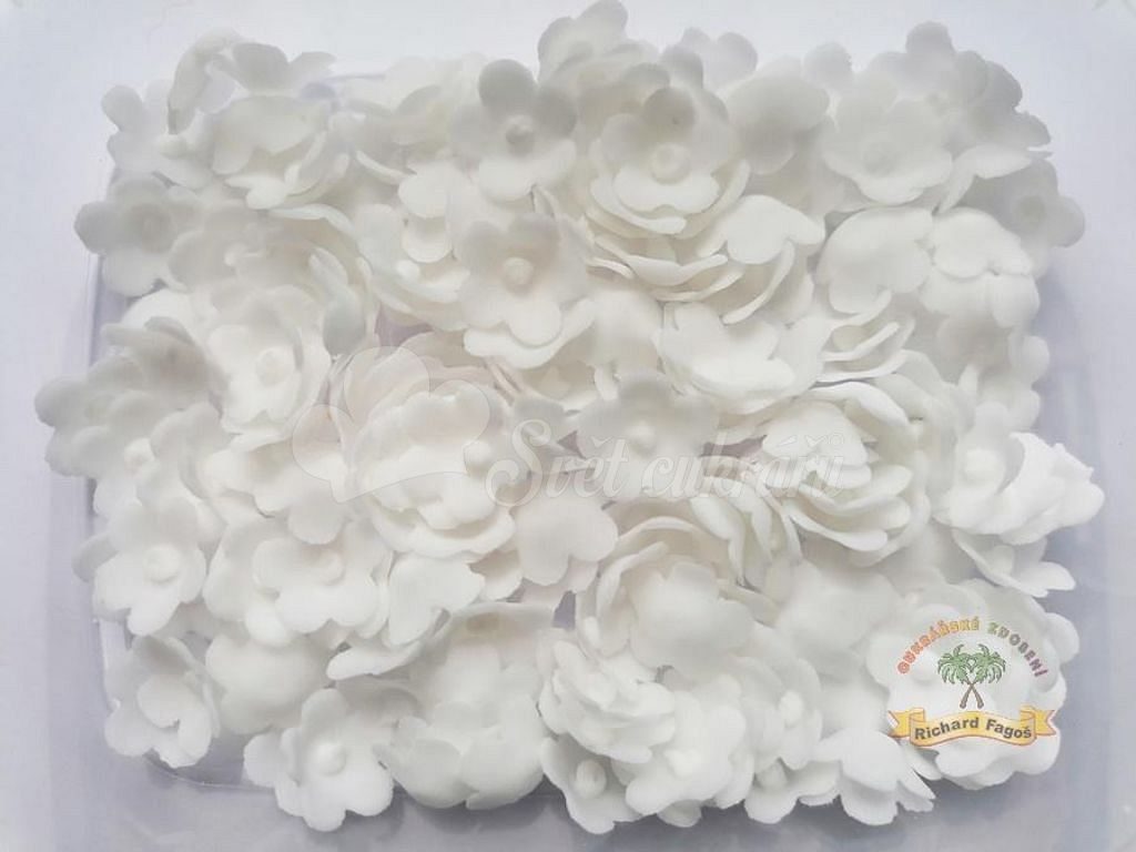 Modelované kvietky biele 20 g dodajú tortám a zákuskom jemný, elegantný vzhľad bez zdĺhavého modelovania. Ručná výroba a drobný rozmer cca 1 cm sú ideálne na svadobné aj detské sladké dekorácie.