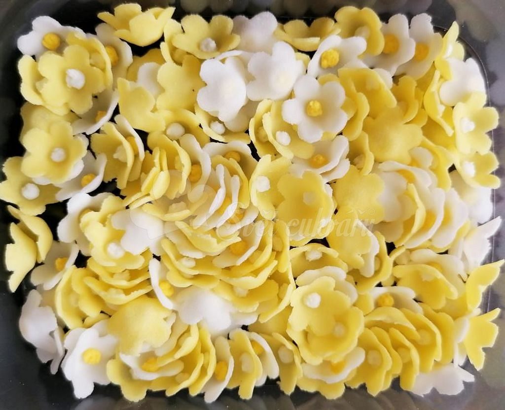 Modelované kvietky žlté 10 g sú ručne vyrábané jedlé cukrové ozdoby, ktoré dodajú tortám a zákuskom žiarivý, veselý detail. V balení nájdeš približne 90 drobných kvietkov so šírkou cca 1 cm.