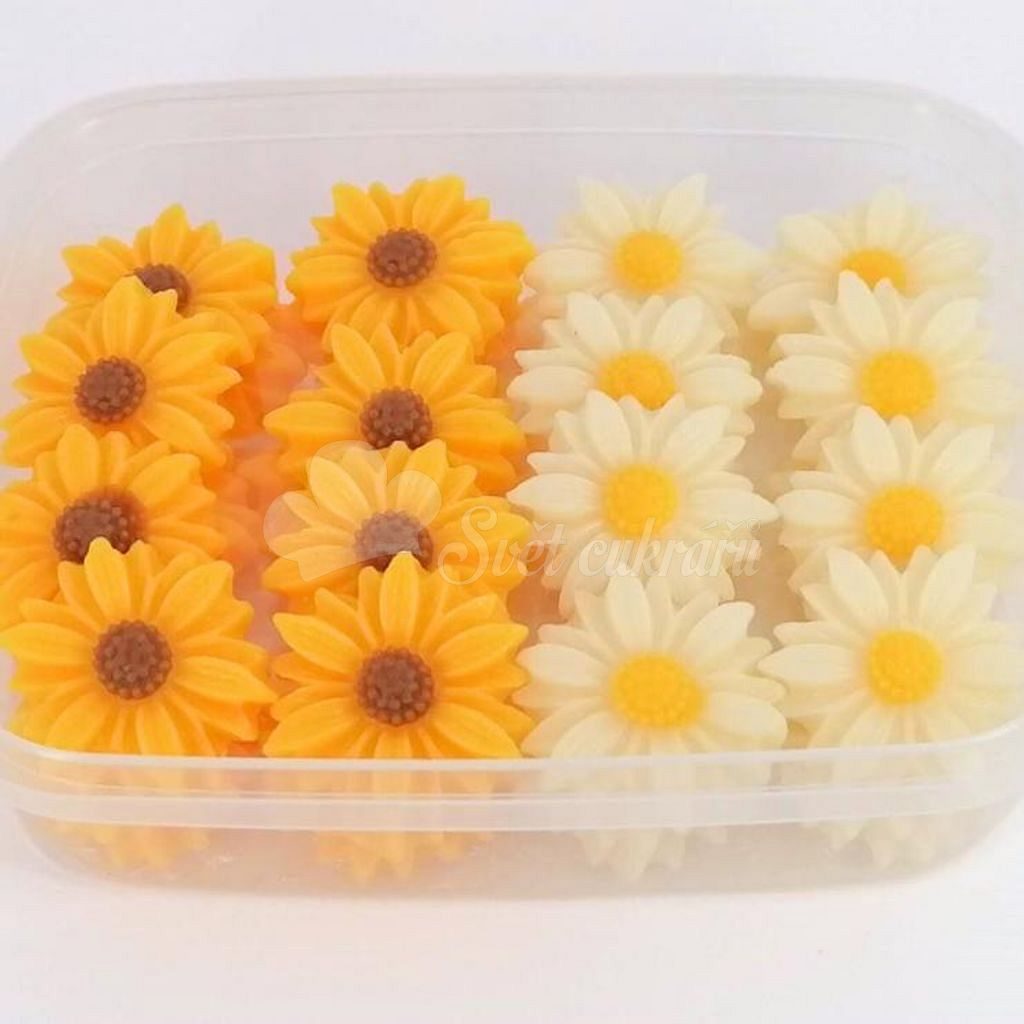 Jedlé ručne vyrábané kvietky Sedmokrásky a slnečnice (40 ks) z kokosovej modelovacej hmoty s jemnou arómou sladkých mandlí. Ideálne na rýchle a efektné dozdobenie tort, zákuskov či cupcakes.