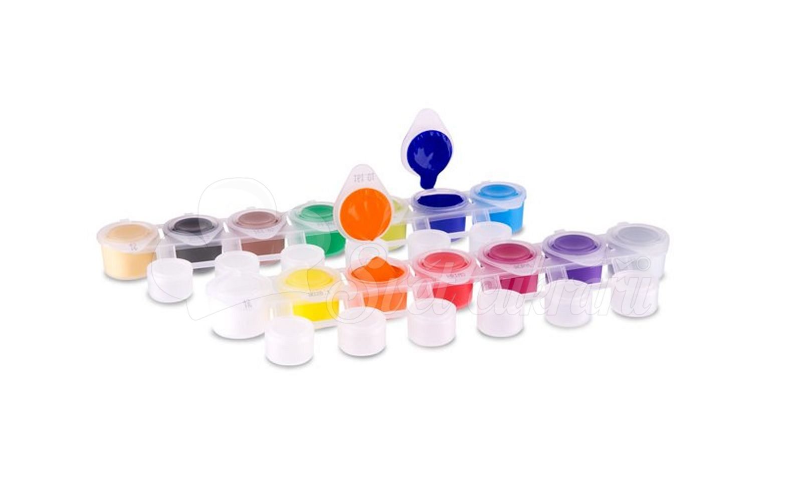 Sada jemných akrylových farieb. Blistrové balenie 14 farieb v 4,5 ml uzatvárateľných nádobkách so zásobníkmi na miešanie a štetcom.