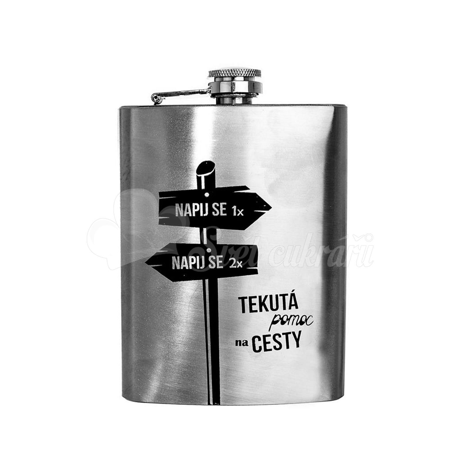 Kapesná nerezová láhev TEKUTÁ POMOC NA CESTY 0,24 l