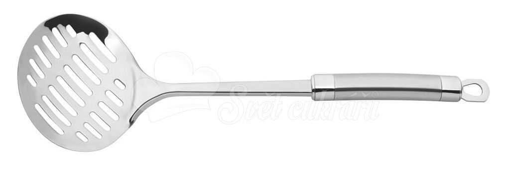 Nerezová naberačka na penu Exquisite s dĺžkou 37 cm je praktickým a elegantným pomocníkom do každej kuchyne. Ideálna na odstraňovanie peny z polievok, vývarov či omáčok, pričom jej moderný dizajn dokonale zapadne do vašej kuchynskej výbavy. Vďaka kombinácii matného a lešteného povrchu pôsobí luxusne a štýlovo. Kvalitné materiály zaručujú dlhú životnosť a možnosť umývania v umývačke riadu uľahčuje údržbu.