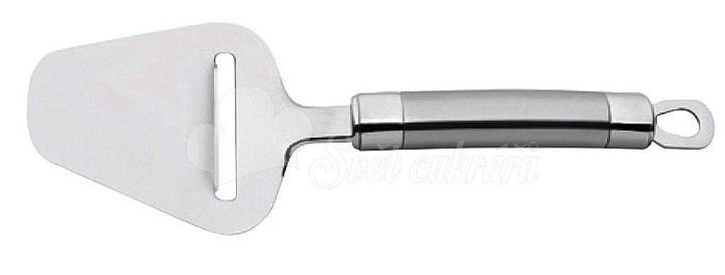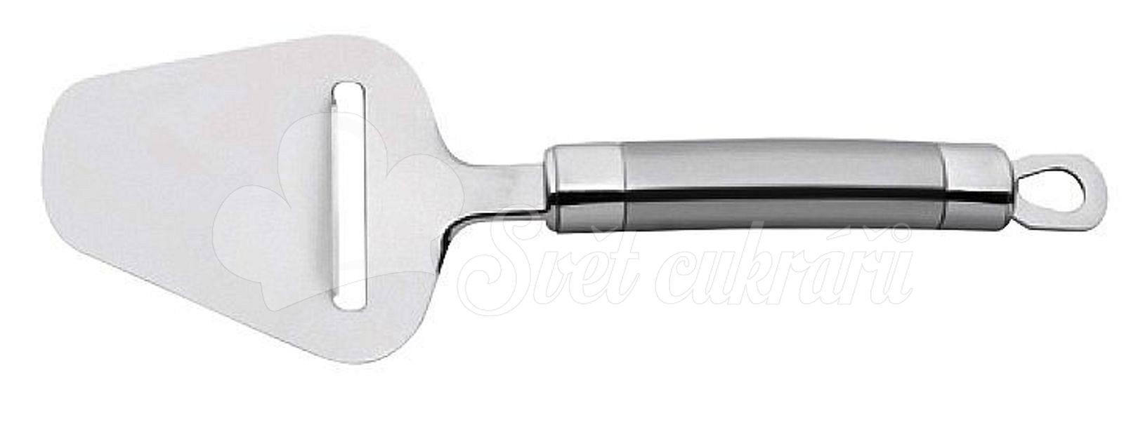 Elegantný plátkovač na syr z nerezovej ocele, ktorý kombinuje matné a lesklé povrchy, je ideálny na pohodlné krájanie syra a je vhodný aj do umývačky riadu.