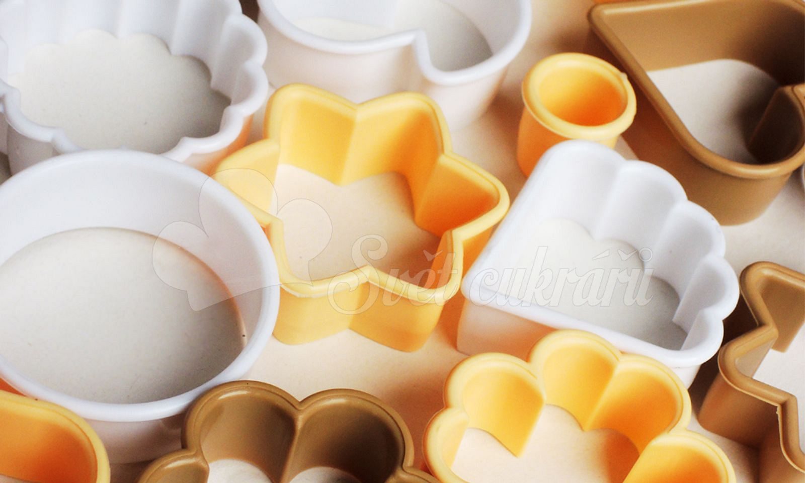 Set 12 ks vykrajovátek v různých tvarech (kolečko, vějíř, hvězdička, jablko, hříbek...). Velikost cca 4,5 cm.