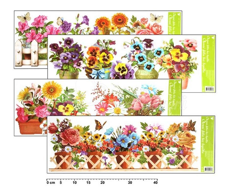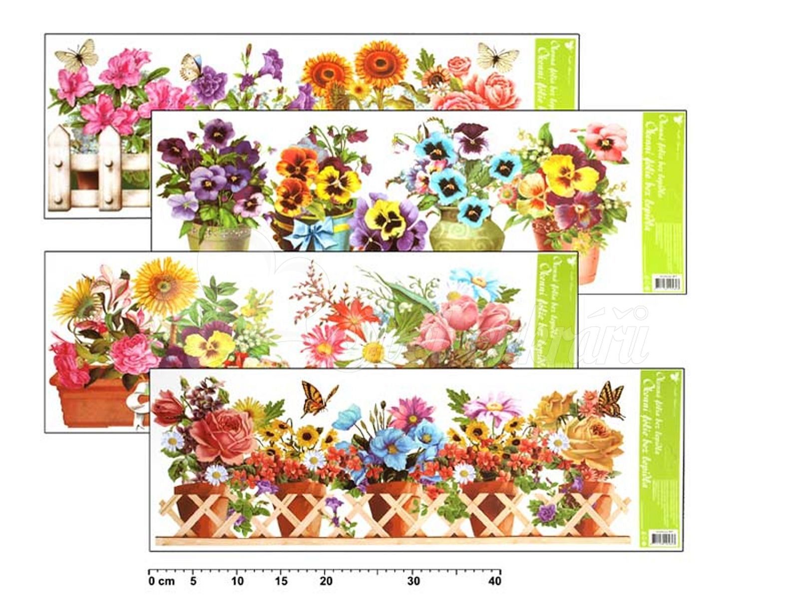 Okenný pruh - Kvety v krabici - Ozdobte si okno týmito krásnymi okennými samolepkami. Vytvoria vo vašom domove čarovnú atmosféru. Návod na použitie: Odlepte obrázok z podkladu a umiestnite ho na čisté alebo navlhčené sklo tou stranou, ktorá bola na podklade. Obrázok sa prilepí elektrostaticky. Fólia sa ľahko odlepí a dá sa znova umiestniť. Cena je za 1 kus, dodávame v mixe po 4 kusoch podľa skladových zásob.